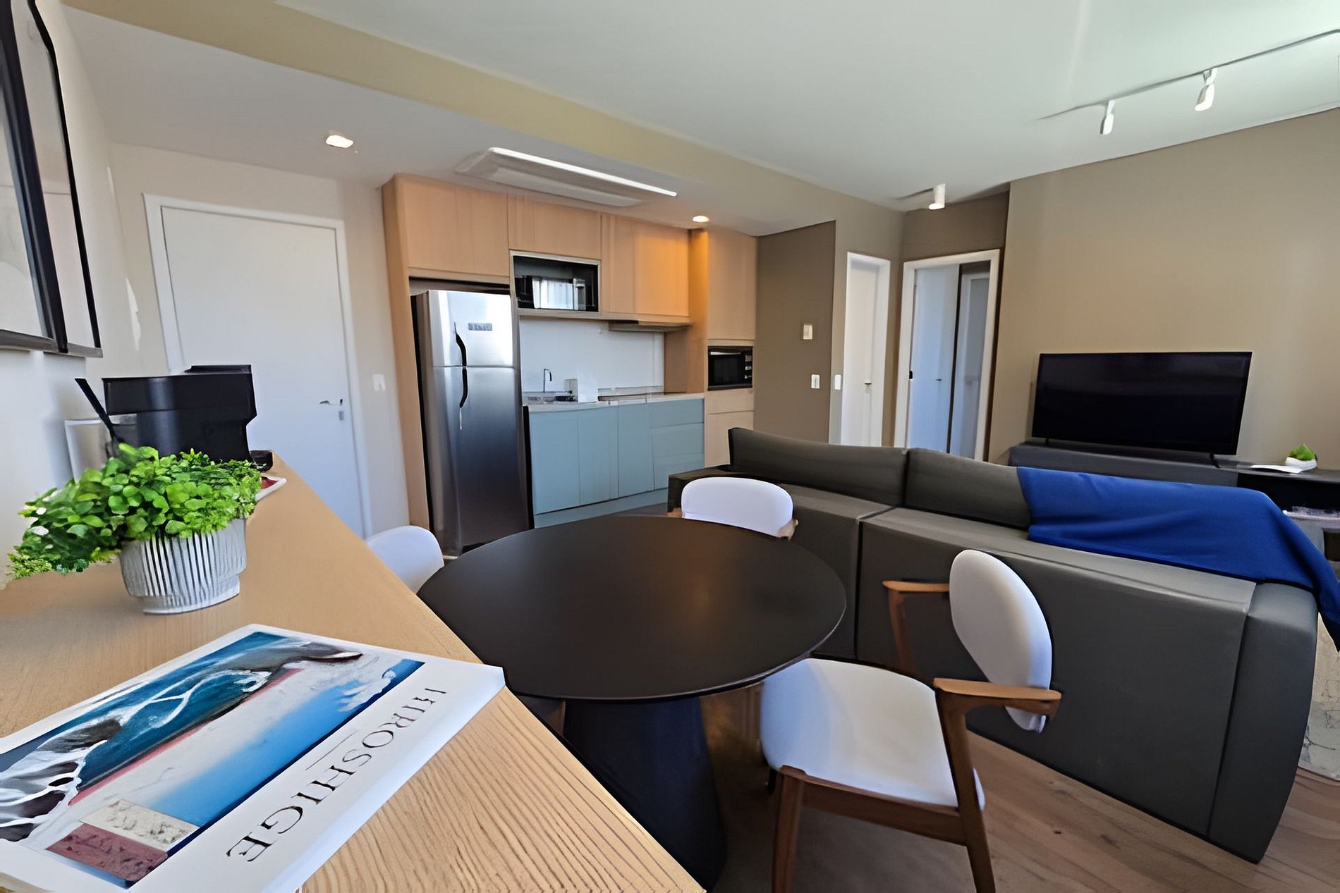 [Quarto] 01 suíte com cama casal e ar condicionado. Armários para suas roupas. Temos lençol, cobertor e toalhas extras se precisar. [Sala] Sala com sofá cama para 01 pessoa confortável, TV e internet. Mesa para refeições e também para home office. Ar condicionado e uma vista privilegiada. [Banheiros] 02 banheiros completos. Fornecemos 1 rolo de papel higiênico em cada banheiro. [Cozinha] Equipada com geladeira, cooktop e microondas. Pratos, copos, talheres, xícaras, panelas e utensílios. Taças para vinho Liquidificador Lavanderia pay per use no Condomínio Todos os móveis novos e de alto padrão.