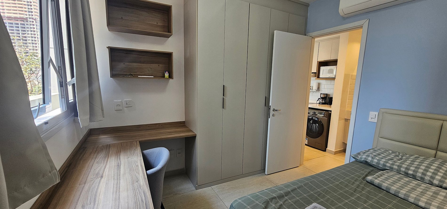 Studio Completo ao lado do Edifício EZ Towers, Huawei e principais empresas do mundo (BMW, Samsung, BYD, Porsche, LG, BYD, GWM, GAC, CGN, Goldwind, Hyundai, Cargill, KPMG e outras). Shoppings : Morumbi, Market Place e Parque da Cidade (cinema é maravilhoso!) Muito próximo ao Consulado dos Estados Unidos (USA). O nosso espaço acomoda confortavelmente até 2 pessoas em 01 cama casal e ar condicionado. Tem sofá cama na sala para acomodar mais 1 hóspede (criança).