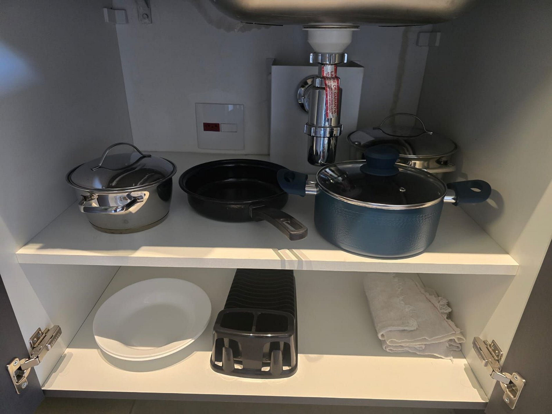 Pratos, copos, taça para vinho, xícaras, panelas e utensílios.