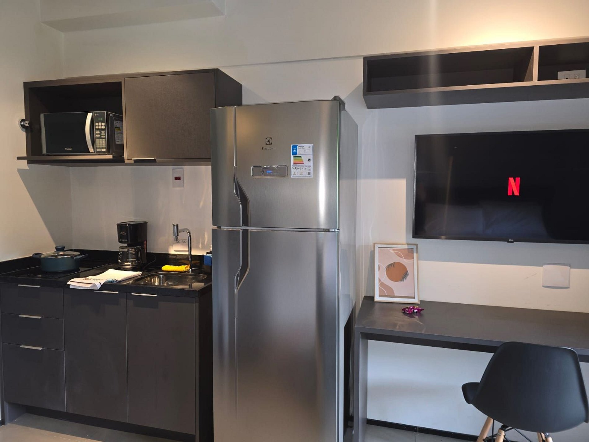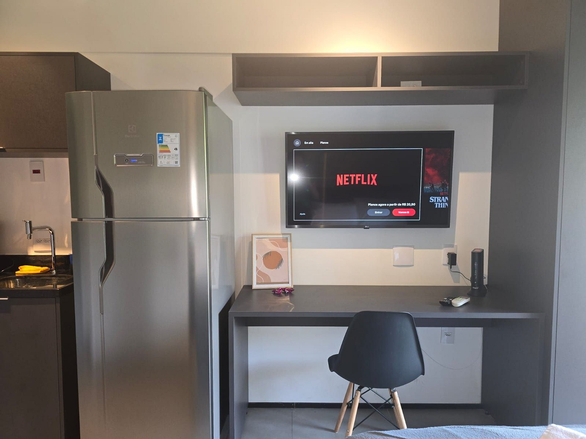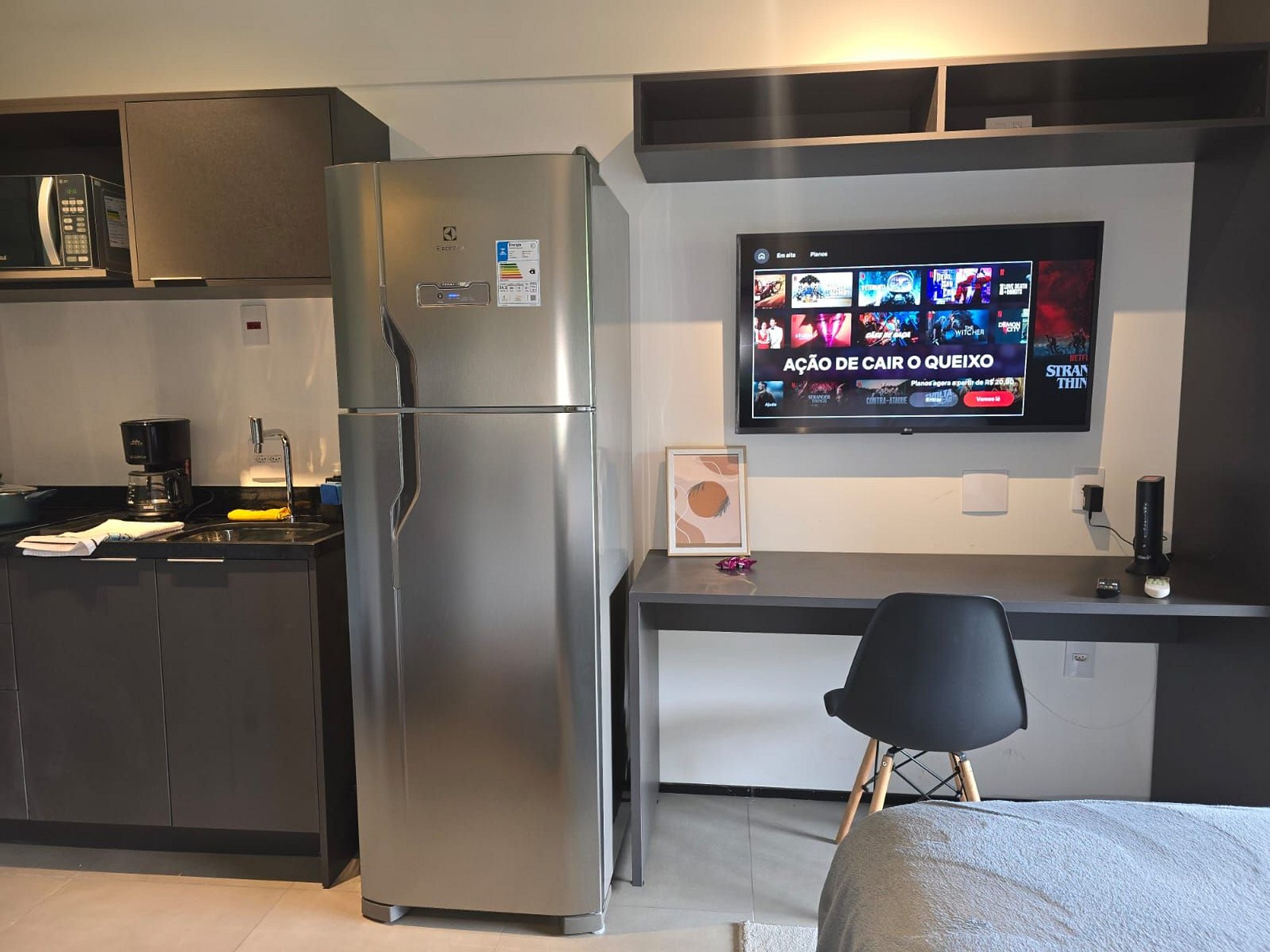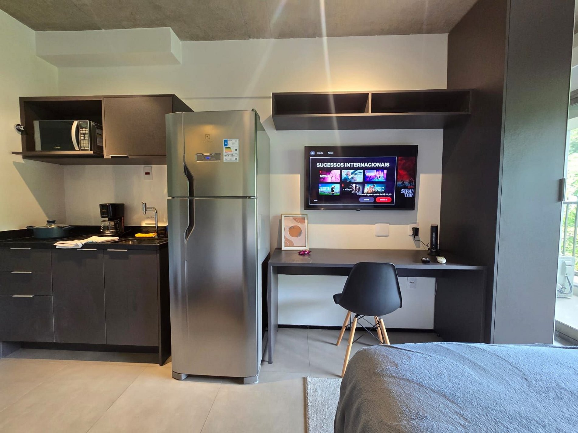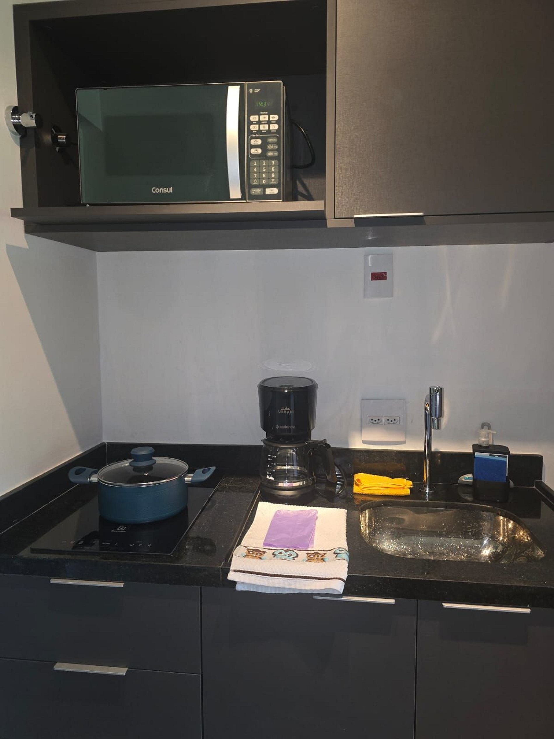 O nosso espaço acomoda confortavelmente até 02 pessoas em 01 studio com ar condicionado e cozinha completa com microondas, fogão, geladeira e utensílios.